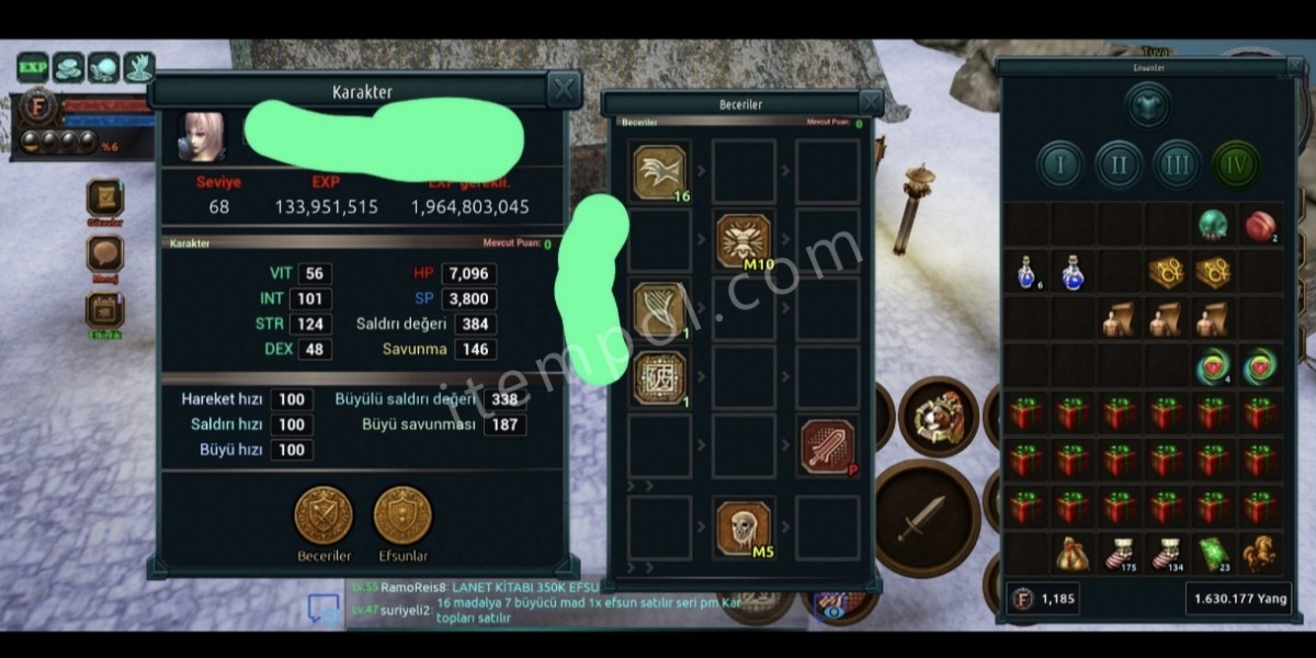 68 lvl At 9 lvl 1100fc Resimdeki itemler Yan charlada 15 Noel kutusu var