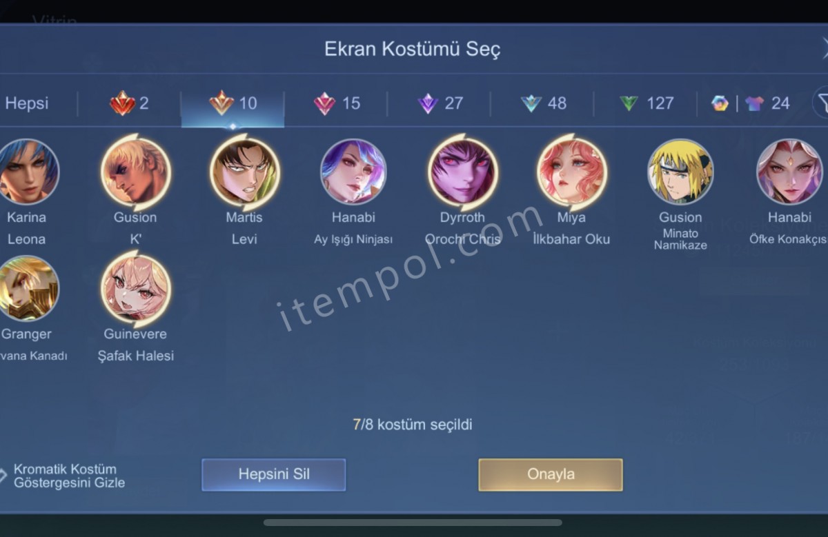 Gus kof ve gus Naruto kostümleri bulunuyor 2 legend var hesapta ek olarak 3700 civarı elmas var hesapta